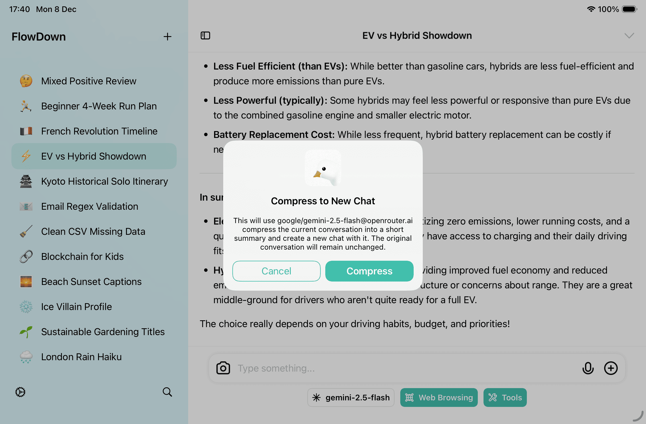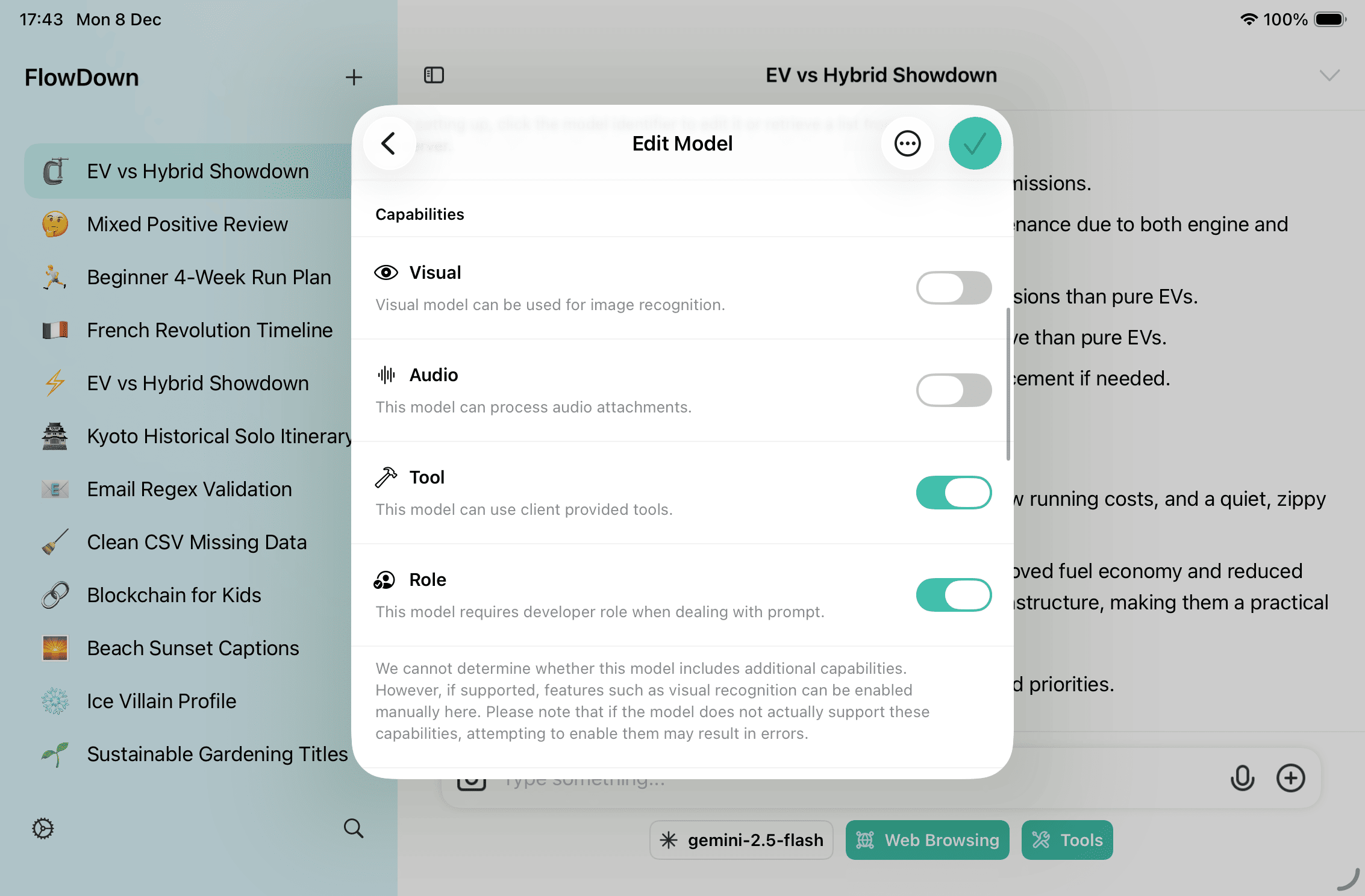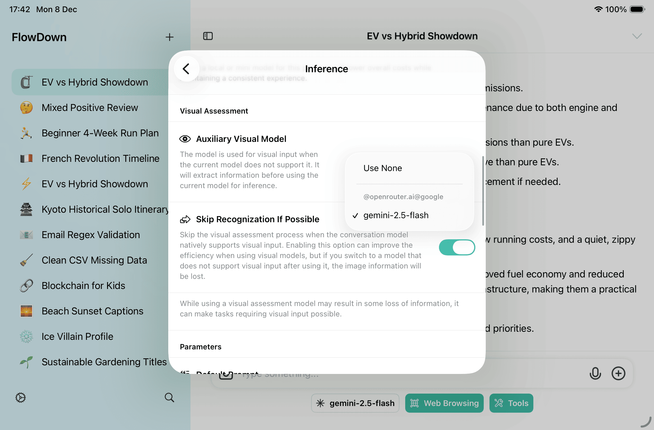 • Text-only models: FlowDown calls the Auxiliary Visual Model to turn images into text before sending.